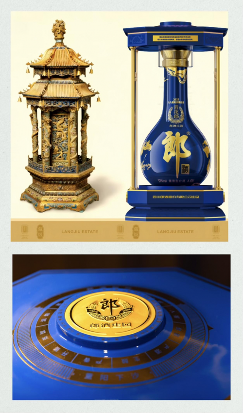 瓶型设计则延续青花郎净水瓶经典造型,瓶身绘有郎酒庄园「生长养藏」图景,流金线条勾勒赤水河蜿蜒脉络;美陈外罩以现代的设计语言,重新诠释石香亭,盒顶部表达青花郎一年生产流程蕴含庄园酱酒的时光故事,深谙东方艺术韵味。