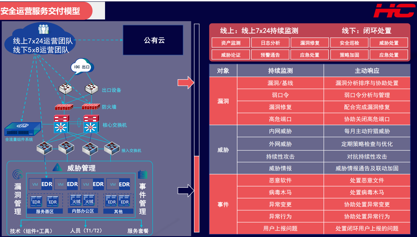 · 安全运维与响应:提供7×24小时安全监测、日志分析、应急响应、驻场运维等服务,实现安全闭环管理。