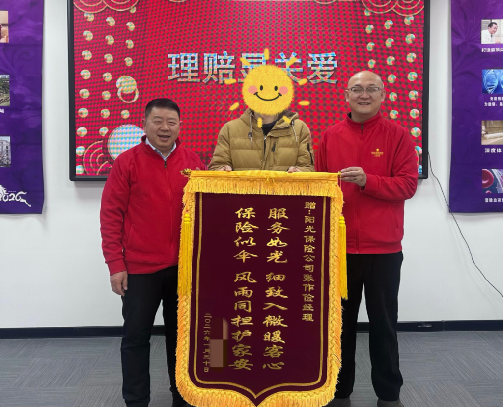 同样的温暖,也在鞍山台安上演。1月30日,阳光人寿台安支公司的职场内,客户王女士将一面印有“尽职尽责办实事 快速理赔暖人心”的锦旗郑重地交到阳光人寿台安支公司负责人杨雪手中,言语间满是感激之情,反复念叨着“多亏了阳光人寿,不然我真不知道该怎么承担这么重的医疗费用”。